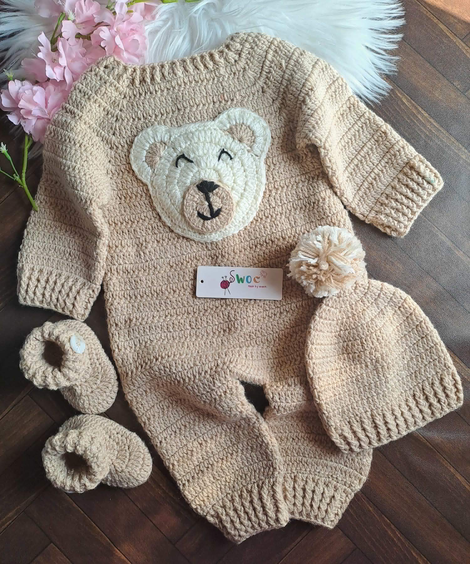 Crochet full length romper, Ribbed beanie and boots with bear motifs and d-tone Pom poms.
